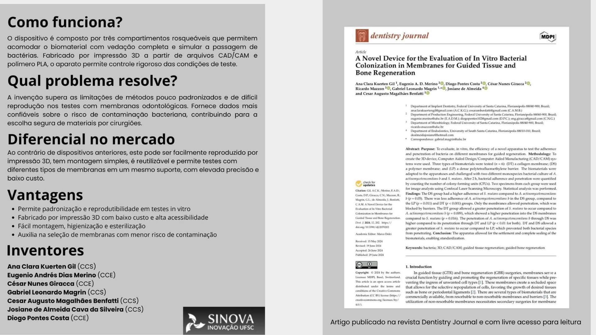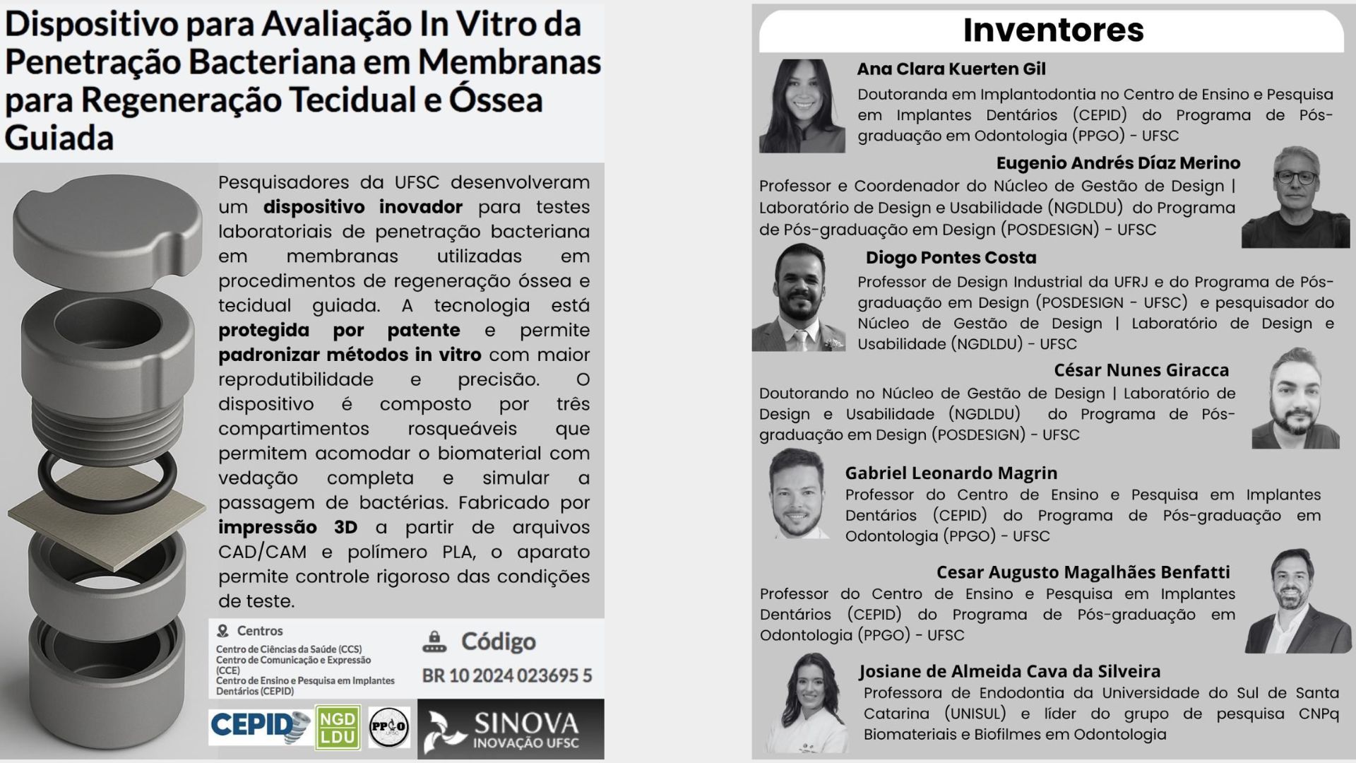 O Programa de Pós-Graduação em Odontologia da UFSC celebra mais um importante avanço científico com o registroda patente de um dispositivo inovador destinado à avaliação in vitro da penetração bacteriana em membranas utilizadas em procedimentos de regeneração tecidual e óssea guiada. Resultado da colaboração entre docentes, discentes e pesquisadores parceiros, a tecnologia alia precisão, padronização e reprodutibilidade em testes laboratoriais, representando um salto significativo na pesquisa translacional aplicada à odontologia. Além de contribuir diretamente para o desenvolvimento de recursos humanos altamente qualificados, a patente reforça o protagonismo da UFSC na produção de ciência e inovação com impacto direto na formação acadêmica, na indústria biomédica e na sociedade. Este avanço evidencia o papel estratégico da universidade pública na geração de conhecimento de ponta e na transformação tecnológica em benefício do país.